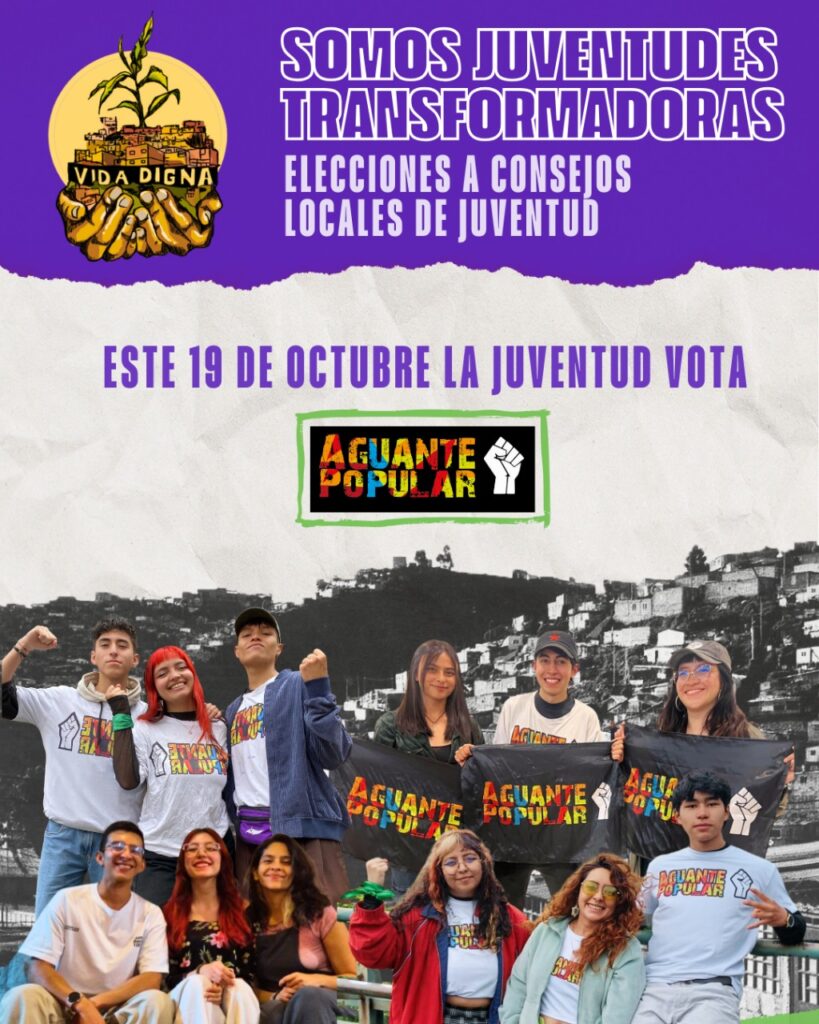 Desde la medialuna sur, y con impacto en más localidades como Ciudad Bolívar, Kennedy, San Cristóbal y Teusaquillo, el Aguante Popular como organización social lleva la voz de la juventud popular a los espacios en los que se toman decisiones para los y las jóvenes, con apuestas claves para defender la vida en todas sus formas posibles, y construir poder popular.