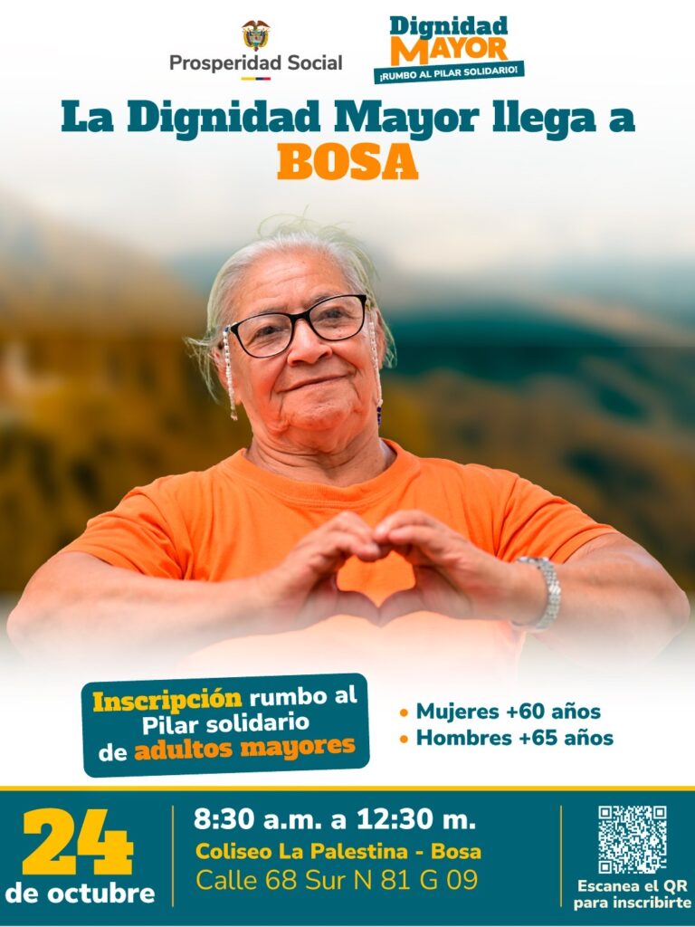 En los barrios de Bosa, la mañana del próximo 24 de octubre promete algo más que una jornada de trámites. Promete esperanza. Bajo el lema “La Dignidad Mayor llega a Bosa”, Prosperidad Social y el programa Dignidad Mayor convocan a mujeres mayores de 60 años y hombres mayores de 65 a participar en la inscripción rumbo al Pilar Solidario, una iniciativa que busca garantizar una renta básica para quienes han dedicado su vida al trabajo, la familia y al país.